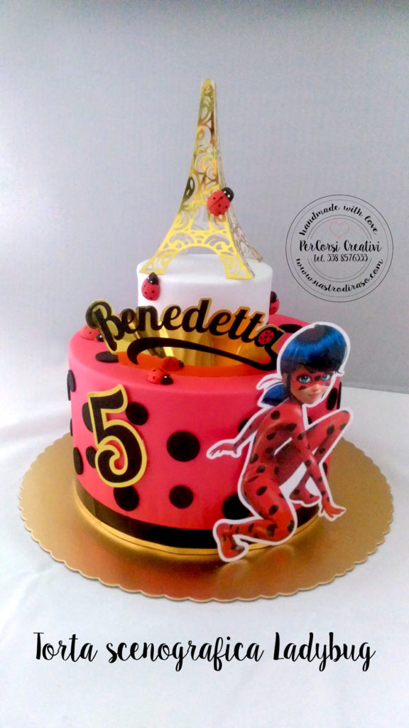Il resto della torta è naturalmente in gomma crepla che rende benissimo l’effetto pasta di zucchero che molti amano, mentre il personaggio di Ladybug è plastificato, così da avere una maggiore rigidità e resistenza.